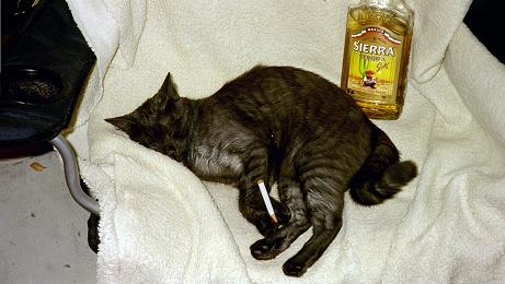 Pamiętam, że mój w dzieciństwie też skoczył za ptaszkiem ze stołu i uderzył czółkiem prosto w szybę, a potem się osunął bez życia na podłogę. A potem wstał, otrząsnął się i żyje do dziś. Czasem wskakuje wieczorem na mój parapet, wyciąga się jak długi wzdłóż okna i się przeciąga. A potem łapie jakieś sznurki wiszące z góry, uderzając łapkami w szybę. Od strony ulicy wygląda to bosko, jakby kot walił łapkami w okno z krzykiem "ratunkuuuuuuuuuu"