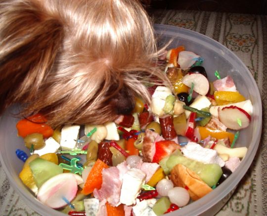 a teraz sobei siedzimy z sunią moją na kanapie przed TV i jemy sylwestrowe koreczki, im bardziej spleśniały i śmierdzący tym dla niej bardziej atrakcyjny... jedynie czarne oliwki jej nie smakują...